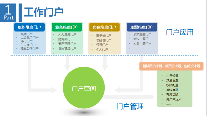 第一環(huán),也是最基本的,企業(yè)內(nèi)部的工作協(xié)作。實(shí)現(xiàn)組織維度門戶、業(yè)務(wù)維度門戶的建立,二元化工作流,知識的沉淀與分享,企業(yè)文化建設(shè)。