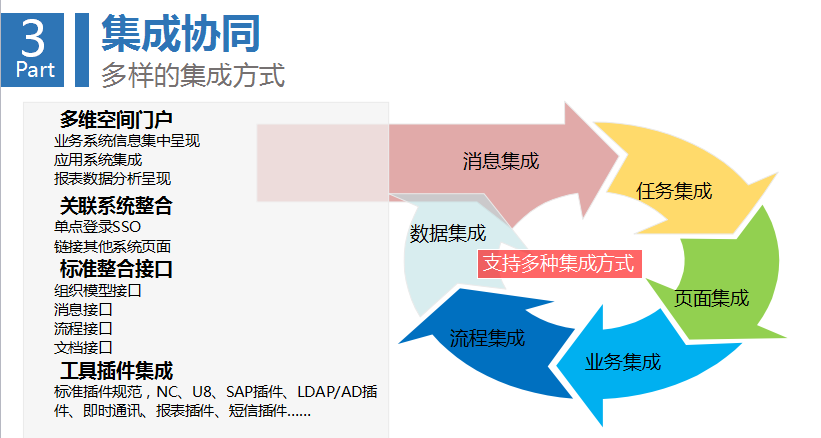 第三環(huán)是集成協(xié)同。任何企業(yè)都在多個系統(tǒng)中間,要思考多個系統(tǒng)之間怎么把數(shù)據(jù)共享起來?怎么把信息整合起來?怎么產(chǎn)生通用的信息門戶,能達(dá)到更高效的信息推送和自動推薦?