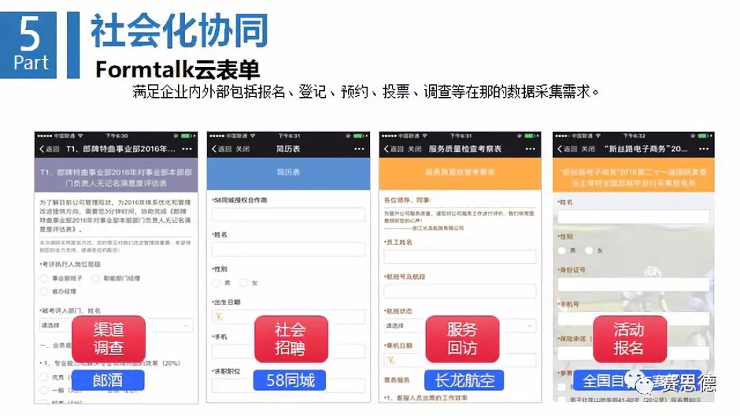 第五環(huán)是社會化協(xié)同。任何企業(yè)都要知道,客戶的第一反應(yīng)是什么,知道下游供應(yīng)商的隨動是什么?與其他社交軟件打通,實(shí)現(xiàn)移動辦公。